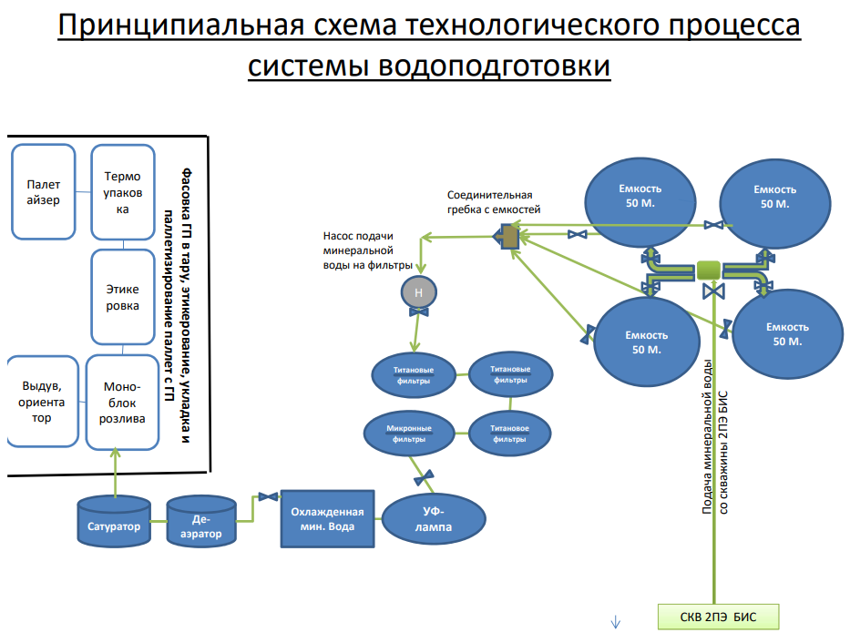 Подача минеральной воды происходит по минералопроводу непосредственно из скважины 2ПЭ БИС с глубины 450 м. Вода подается в 4 объединенные емкости по 50 куб.м каждая